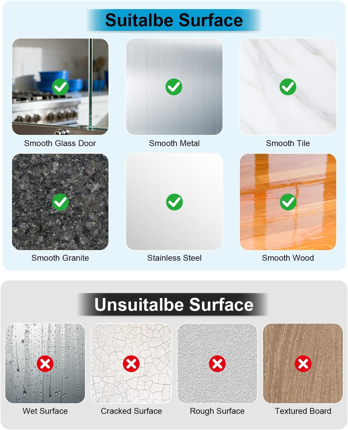- ⚠️Only Work: Do not install the suction cup hook on grout lines. The suction cup only works on smooth, non-porous surfaces such as glass, tiles, marble, metal, and stainless steel. Not suitable for damp, greasy, rough, lime-coated, cracked, or cement walls. Improper installation may cause loss of suction. If it doesn’t stick at first, wash and dry the suction cup, then test it on smooth glass. If it holds firmly on glass but not on your wall, the surface is unsuitable—please choose another surface.