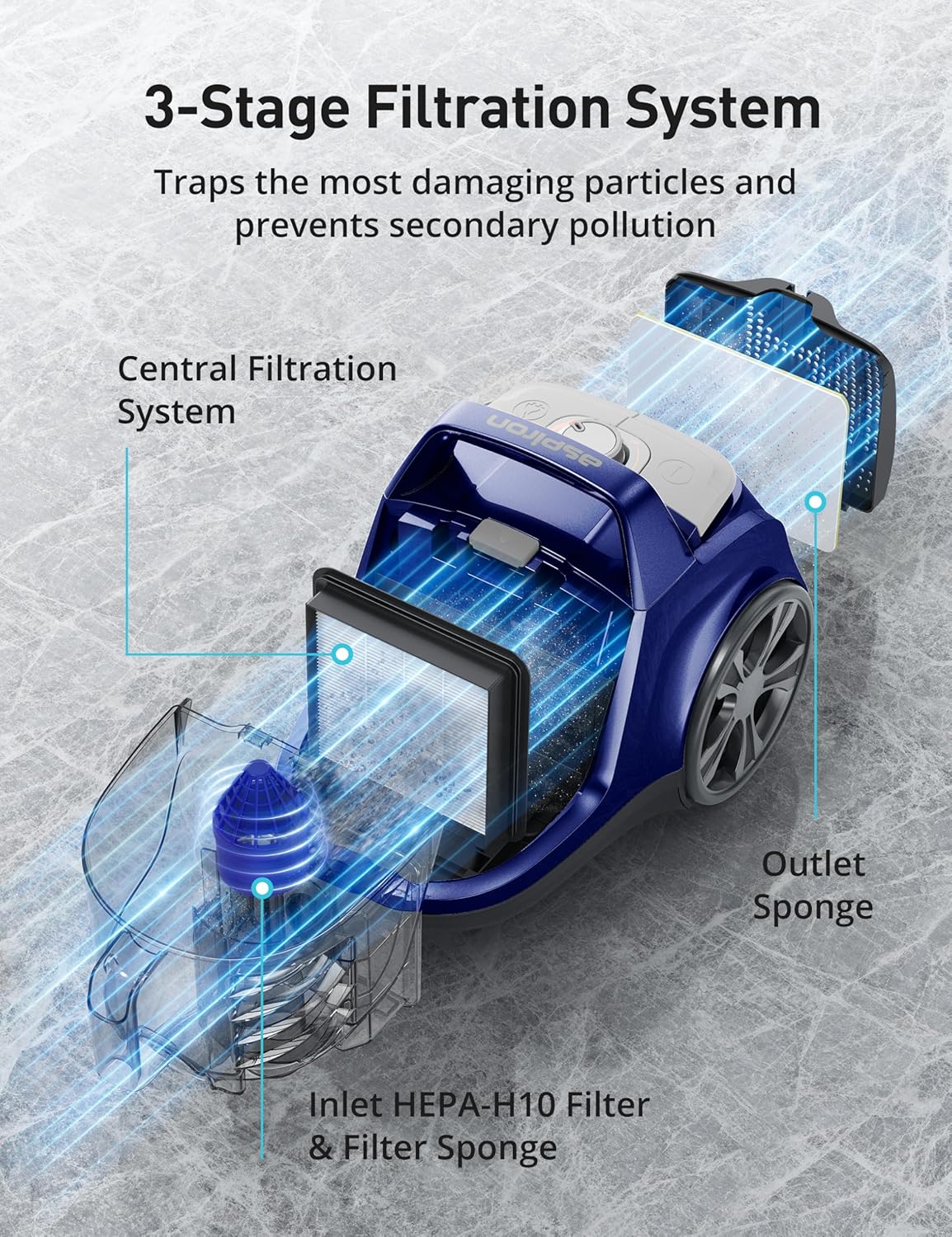 Aspiron Canister Vacuum, Upgraded 1600W Bagless Canister Vacuum Cleaner, Auto Cord Rewind, H13 HEPA Filter, 3.7Qt Large Capacity, 5 Tools for Hard Floors, Carpet, Pet, Upholstery, Tiles, Car, Navy