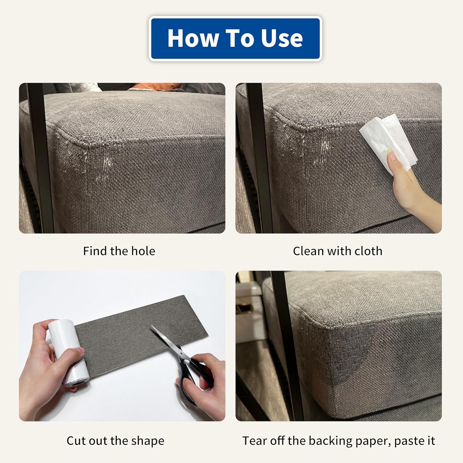 - Easy Application: Clean the damaged area, cut to the appropriate size, peel off the backing paper, and stick it to the damaged area. It only takes a few seconds to complete, and the repair effect is natural and tidy. Suitable for repairing linen products such as sofas, curtains, cushions, furniture, interior decorative fabrics, etc.