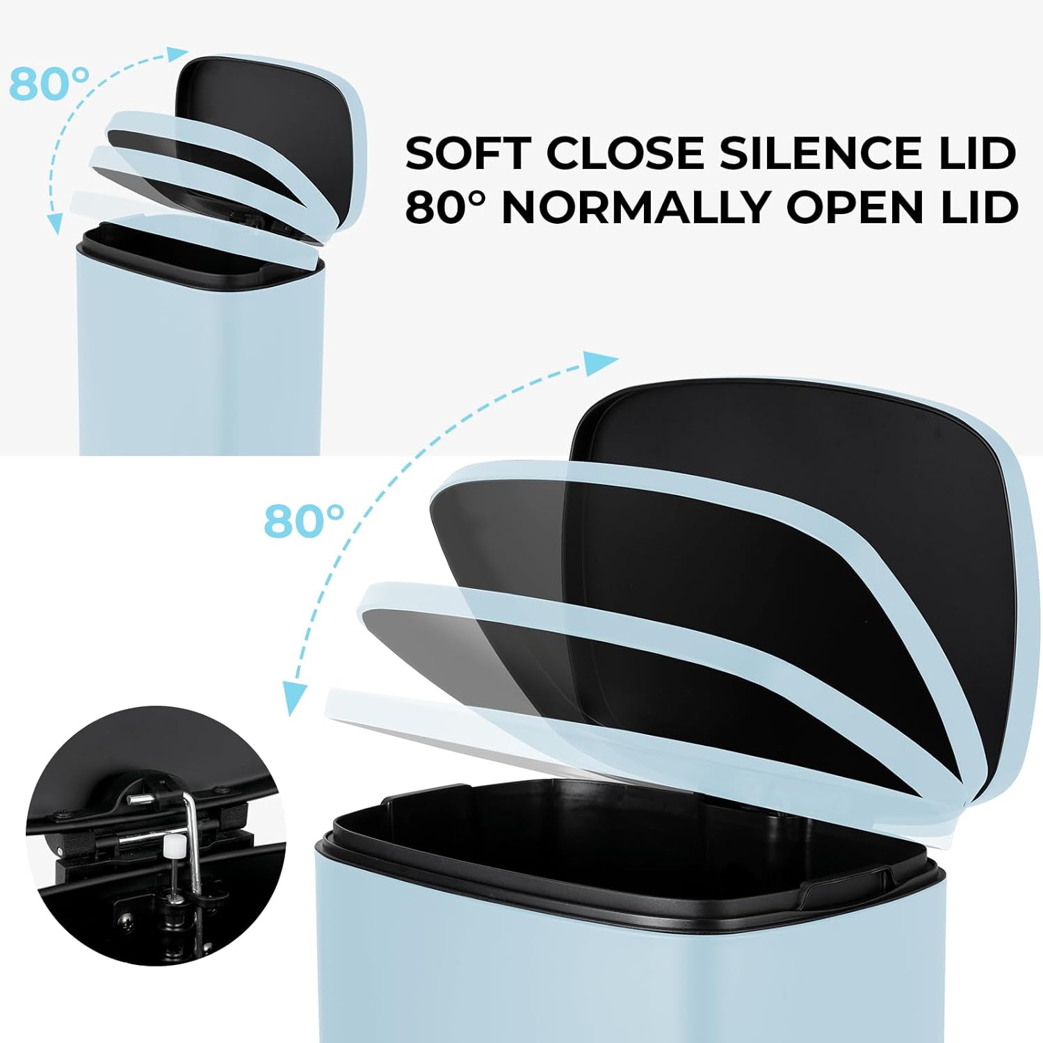 - Quiet Closing&Lid-lock: Heavy-duty garbage can is built with integrated step pedal mechanism and the force damper, which soft open and close lid while preventing slamming and banging. Lid-lock can help keep trash can open without stepping if you are inconvenient to keep stepping on pedal.