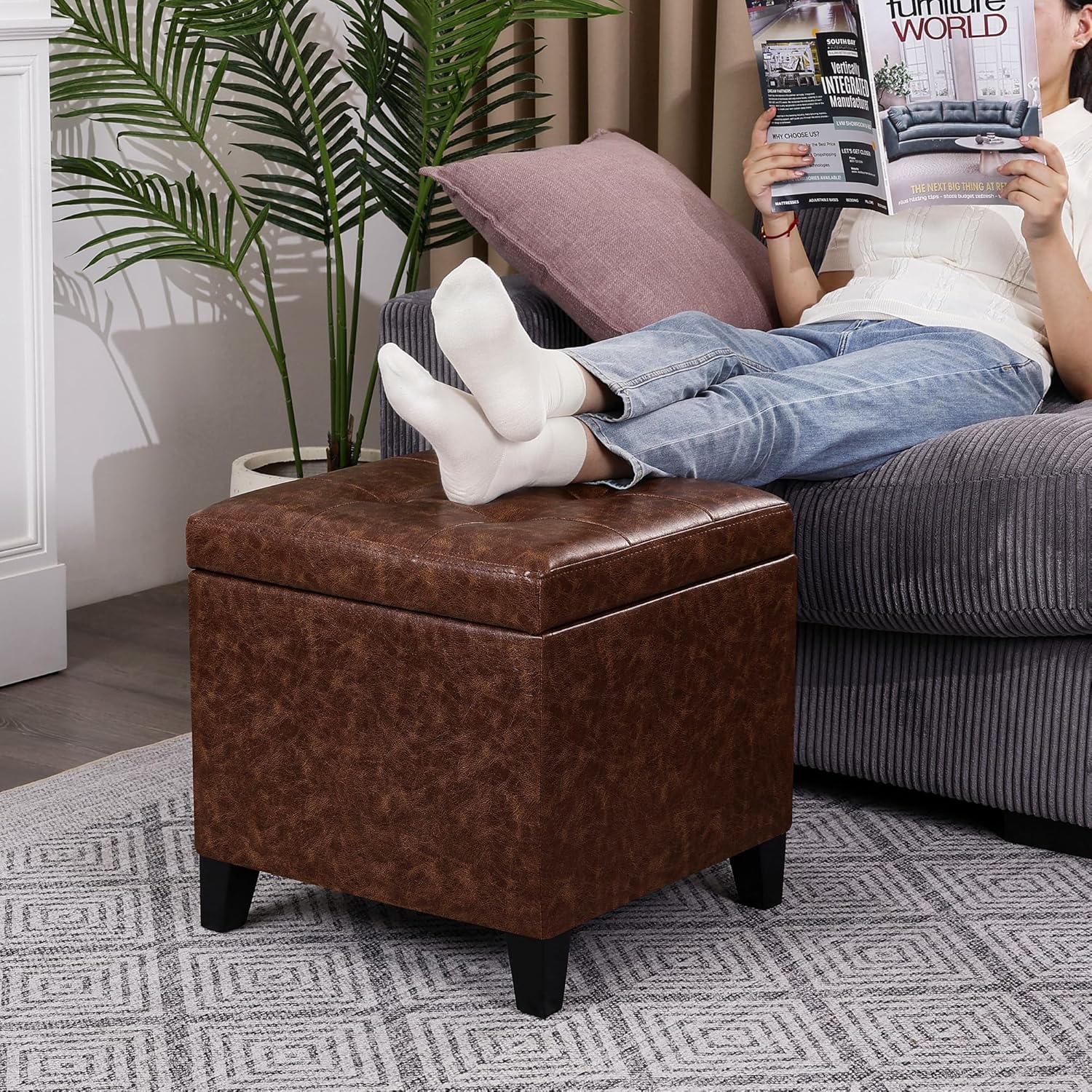Adeco 18" Storage Ottoman Foot Rest Stool, Walnut Leather Ottoman with Black Solid Wood Legs and Hinged Lid, Small Foot Stool for Living Room, Bedroom