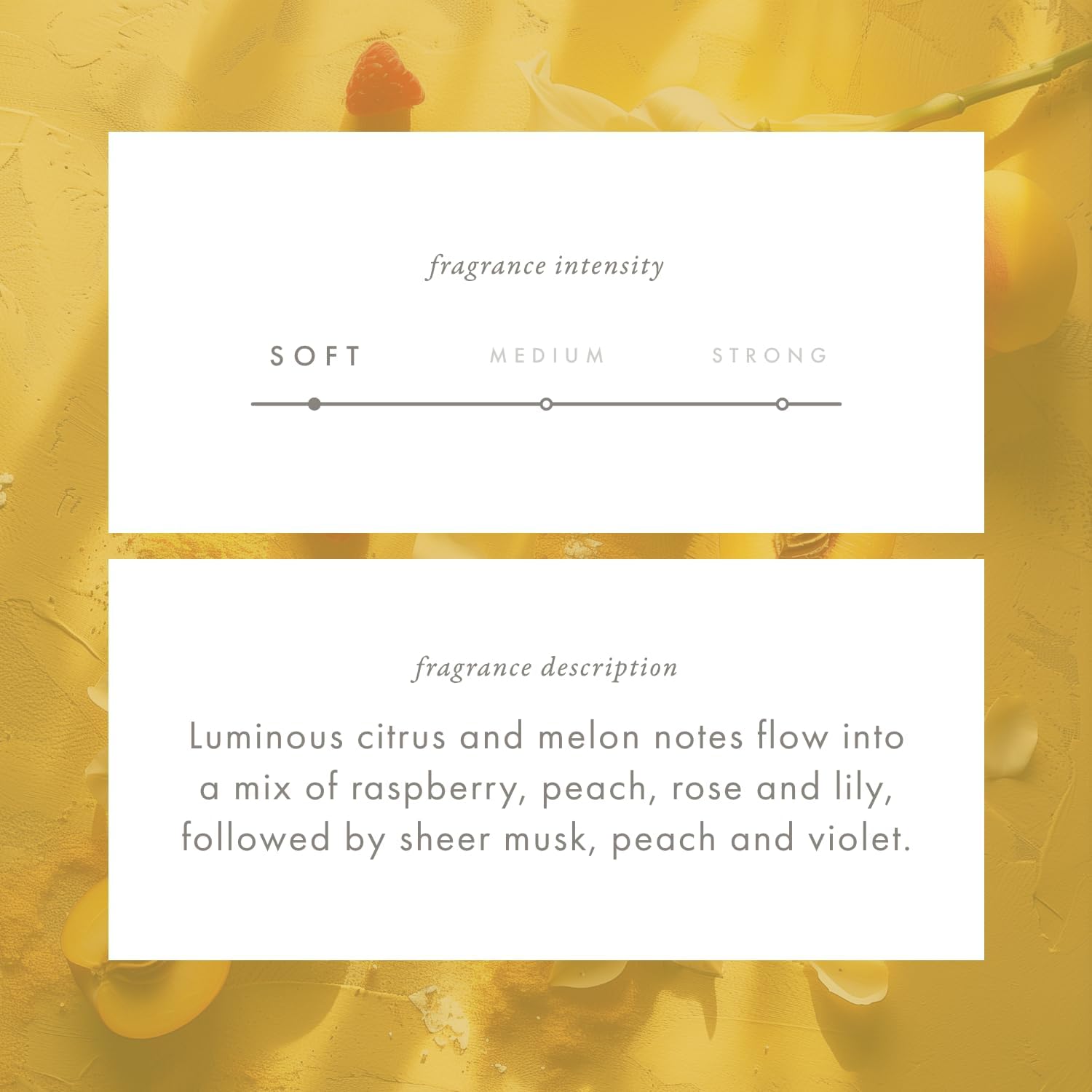 - Crisp & Invigorating Fruity Floral Scent โ A soft, odor-neutralizing fragrance where luminous citrus and melon notes open into a delicate heart of raspberry, peach, rose, and lily, finishing with a sheer base of musk, peach, and violet. From the FruityโFloral family, it captures the uplifting feeling of walking in the rain as the sun breaks through the clouds.