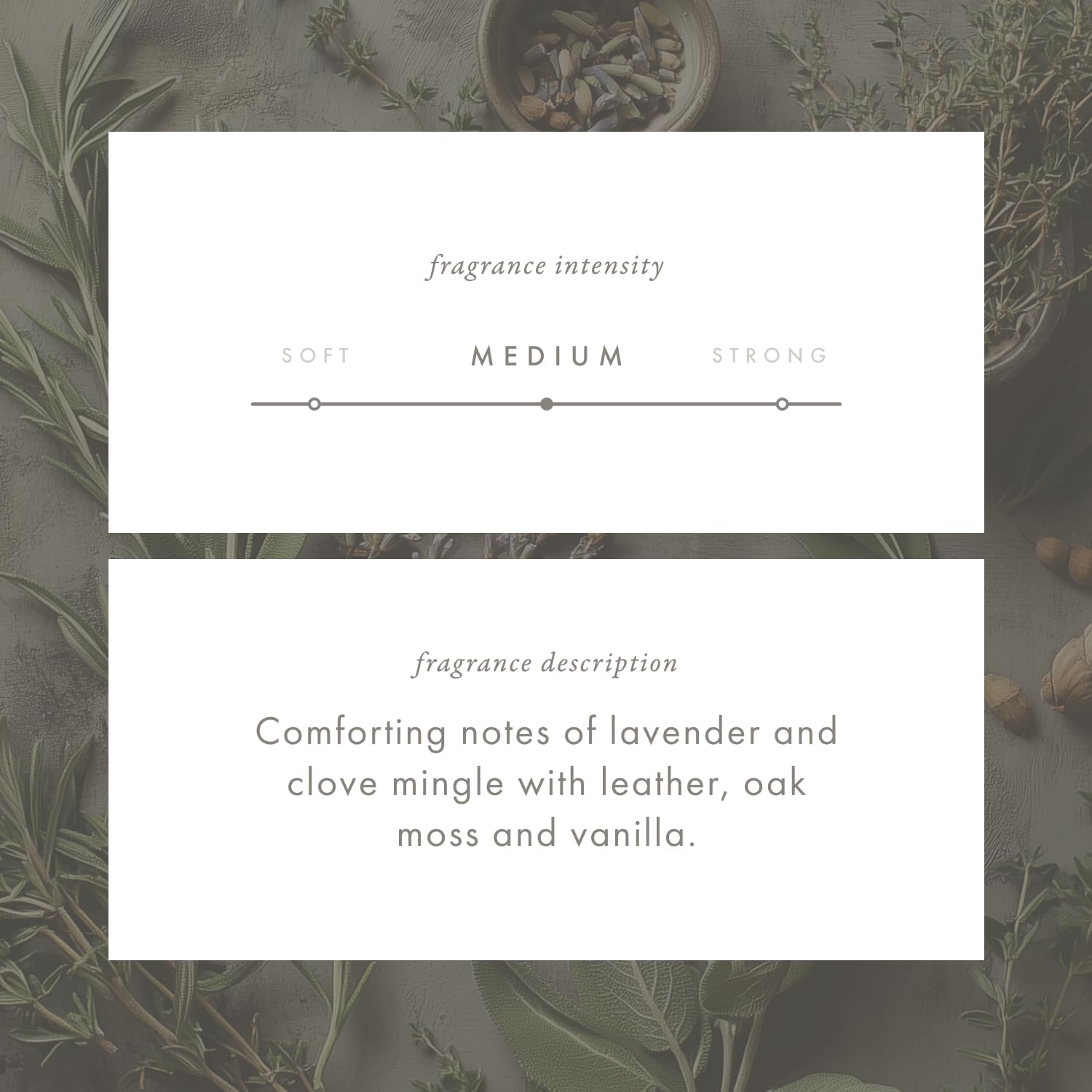 - Warm & Inviting Woody Leathery Scent – A medium-strength fragrance where lavender and clove blend with leather, oak moss, and vanilla, lifted by sage, rosemary, lime, and bergamot top notes, a heart of lavender, ginger, and clove, and a grounding base of oakmoss, timber wood, musk, and vanilla. From the Woody–Leathery family, it smells like relaxing in an aged leather chair beside a bundle of fresh blooms.