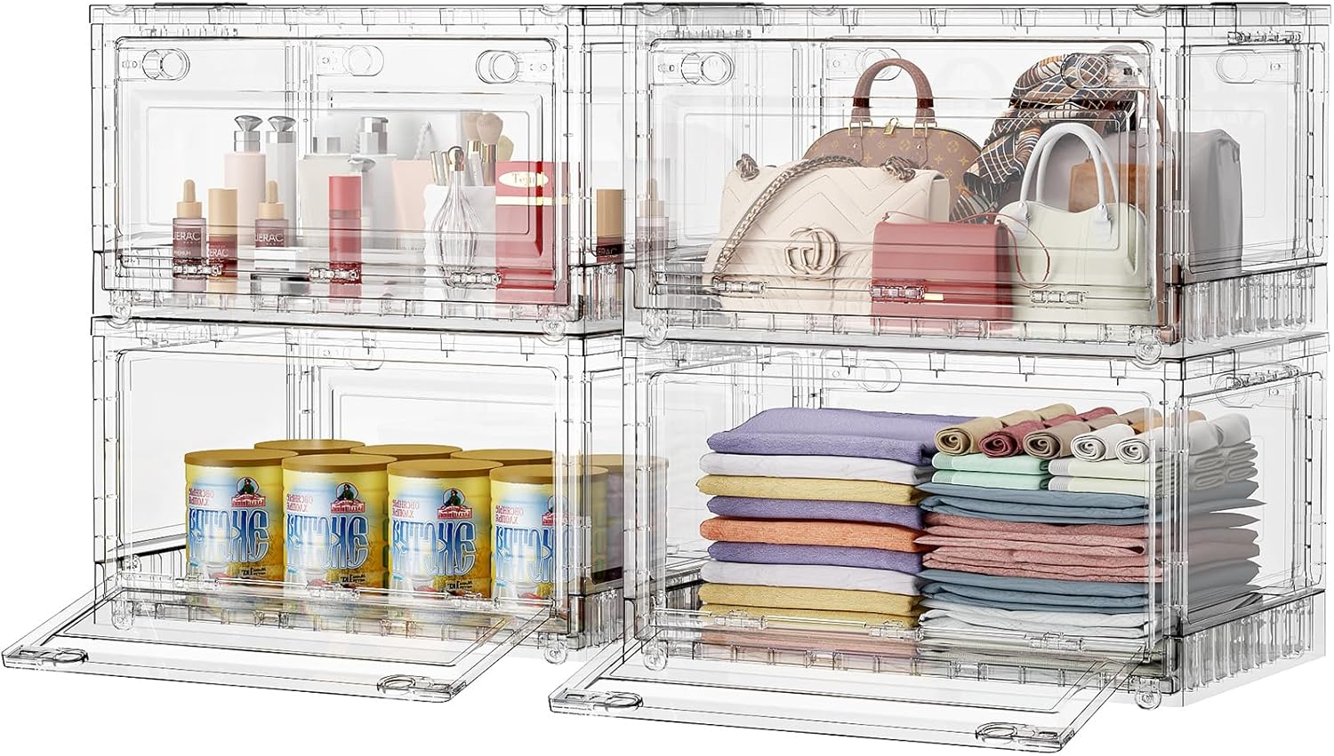 BROVIEW Clear Stackable Storage Bins Drawers, Open Front Large Plastic Storage Bins with Lids, Foldable Closet Organizers and Storage for Wardrobe Cabinets, Pantry, Makeup,4 Pack